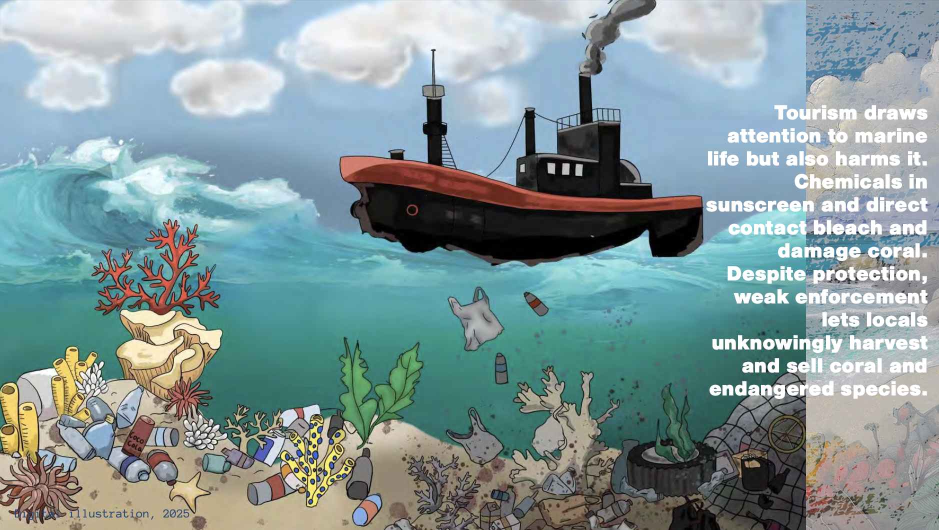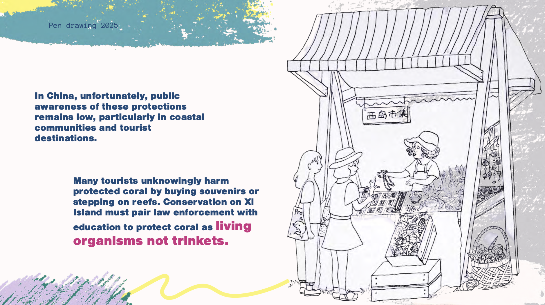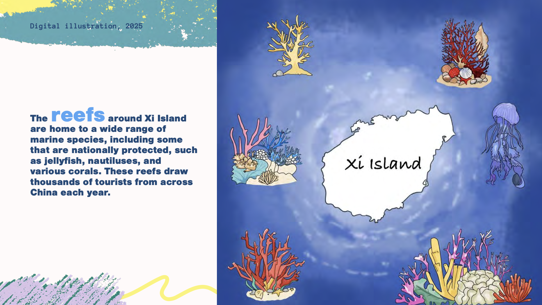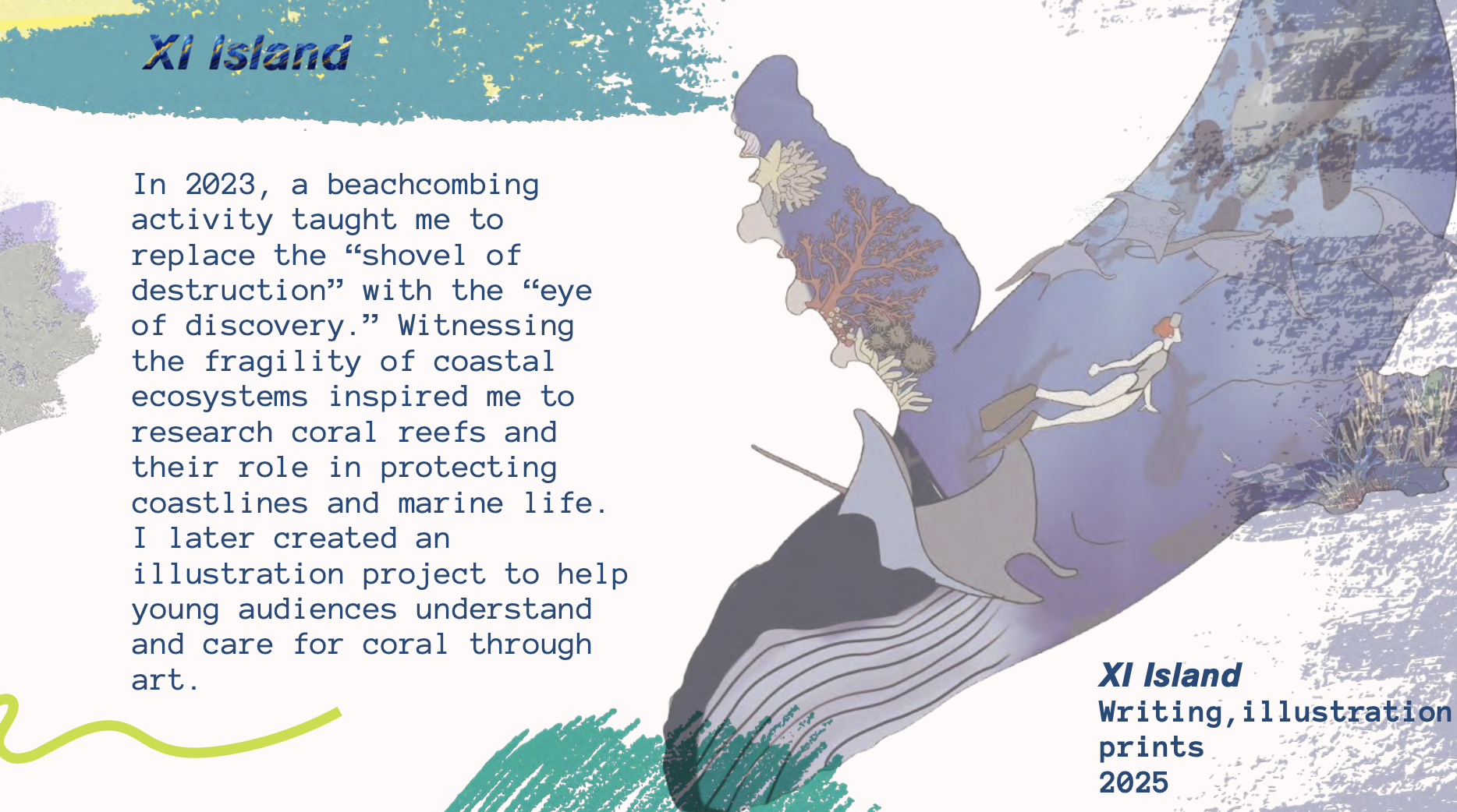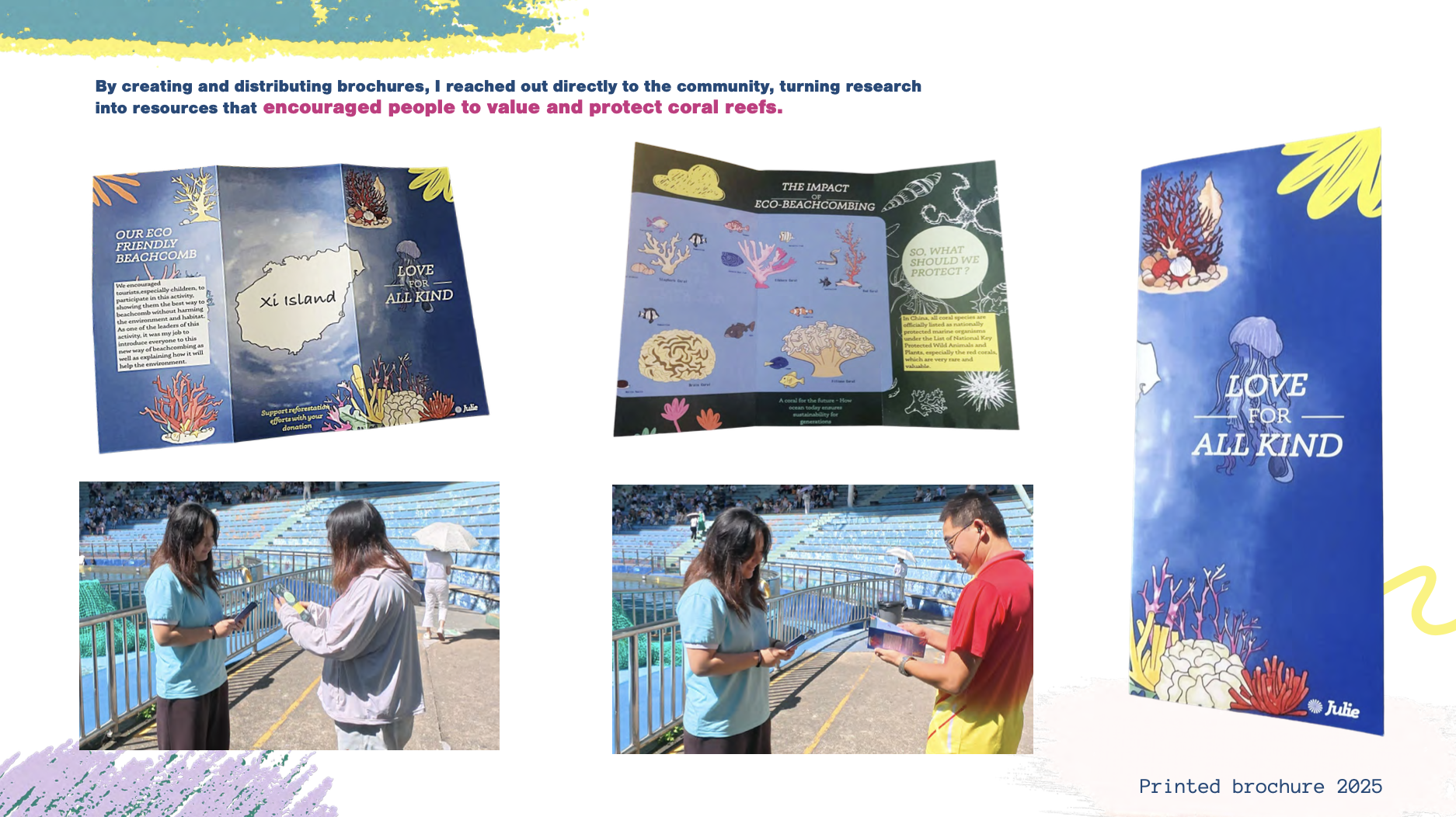 This project began with an eco-beachcombing activity that replaced the “shovel of destruction” with the “eye of discovery.” By teaching children and tourists how to explore beaches responsibly, we raised awareness of coral protection and coastal ecosystems. I later expanded this initiative into a research and illustration project, creating educational brochures that combine environmental science with visual storytelling to inspire community action and ecological responsibility.