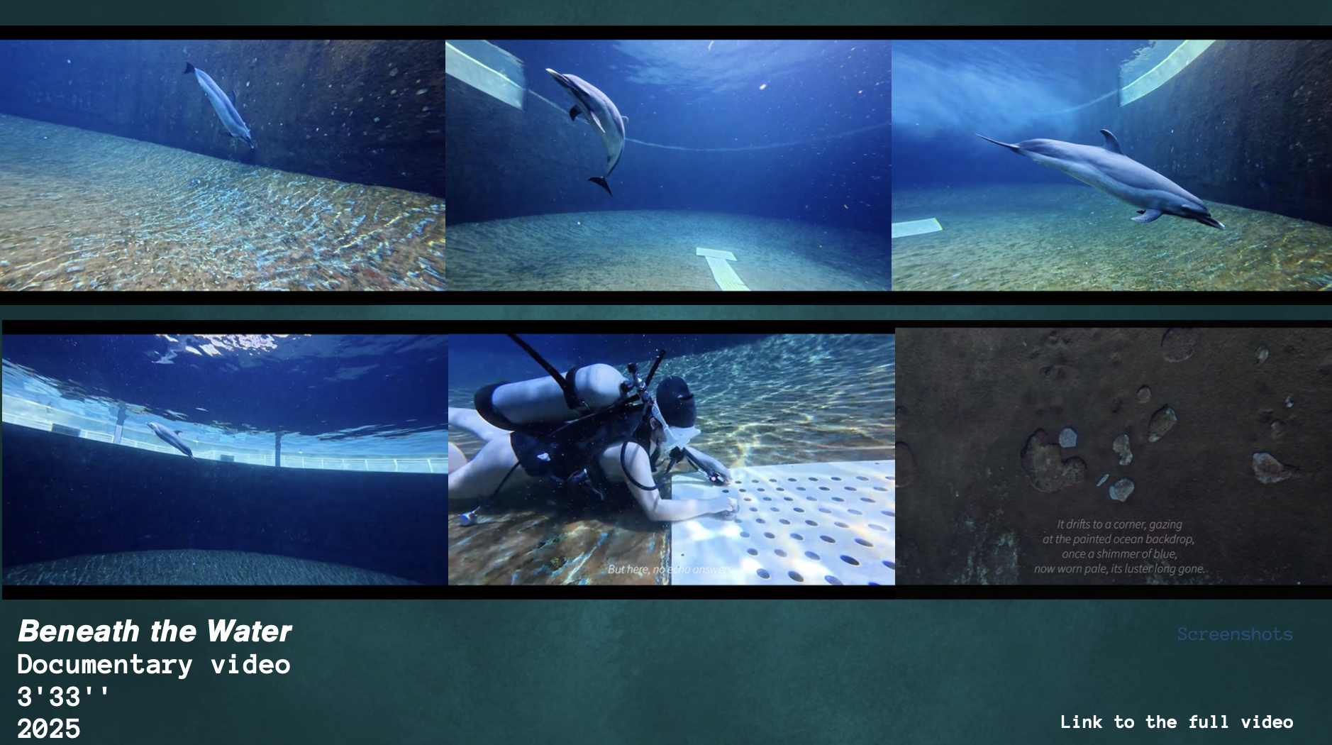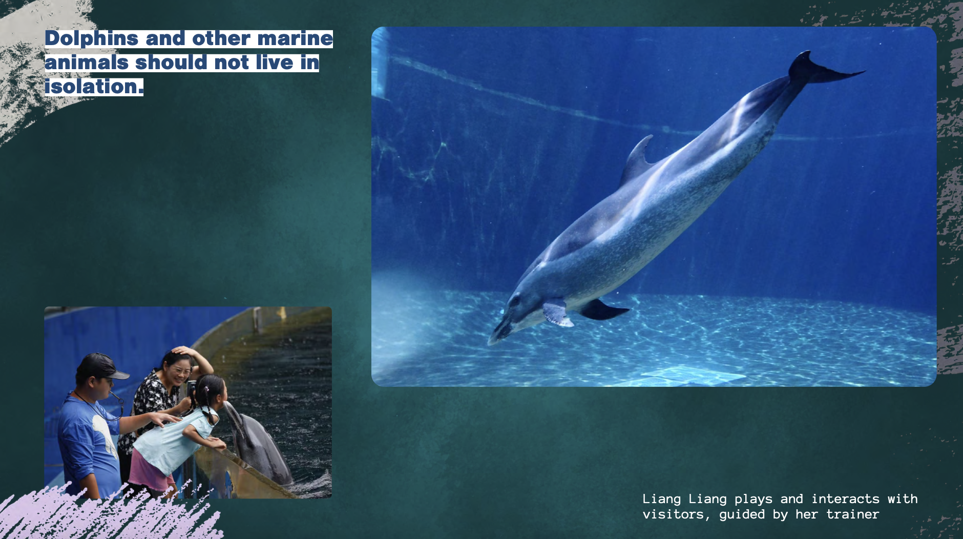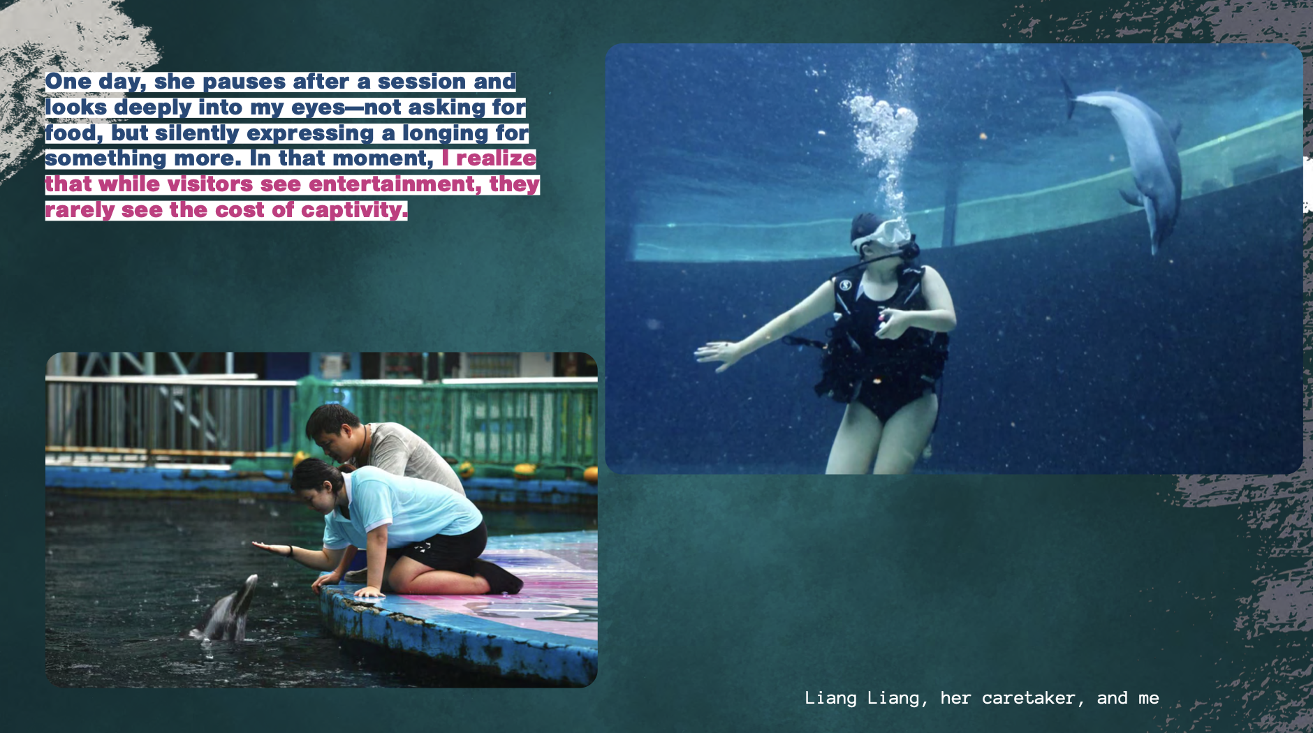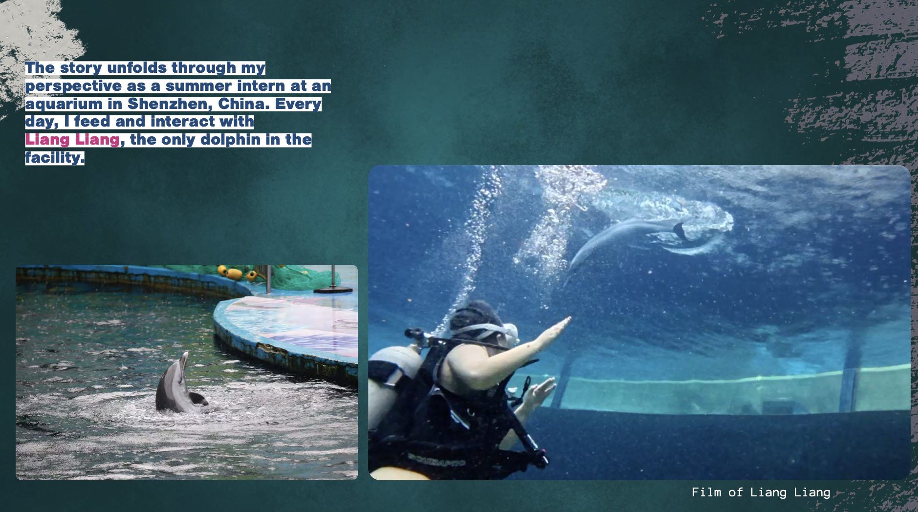 This short film follows Liang Liang, a dolphin living alone in an aquarium, through the eyes of a student intern who cares for her daily. Blending documentary-style visuals with a personal narrative, it reveals the loneliness behind captive marine performances. By contrasting her confined life with the freedom of the open ocean, the film raises awareness of the emotional and ethical issues of marine captivity and calls for greater compassion and responsibility toward ocean life.